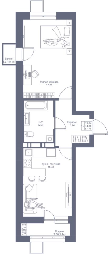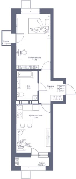 Просторная 1-комнатная квартира с гостиной в 18 кв.м. Отдельная большая кухня, из которой открывается выход на лоджию. Здесь можно организовать дополнительное место для отдыха. Высокие потолки 2, 7 м, правильная геометрия комнат для удобной меблировки.