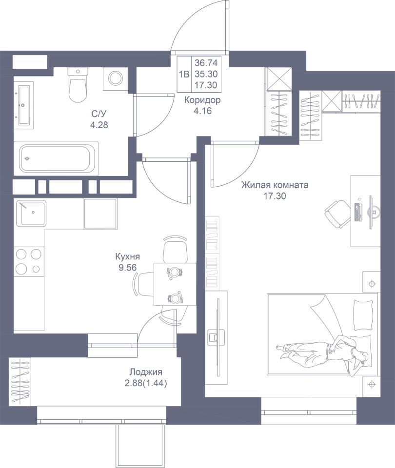 Уютная и продуманная 1-комнатная квартира с просторной евро-гостиной. Кухонная зона расположена в нише, что позволяет скрыть рабочие процессы. Из гостиной открывается выход на лоджию, где можно организовать дополнительное место отдыха.