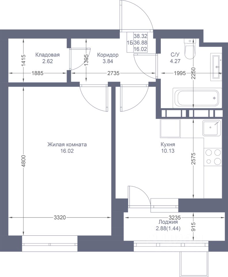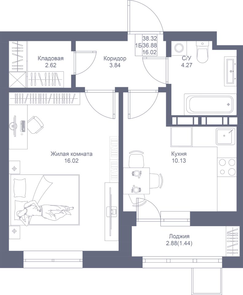 Просторная 1-комнатная квартира с гостиной в 16 кв.м. Отдельная кухня, из которой открывается выход на лоджию увеличенного размера. Высокие потолки 2,7 м, правильная геометрия комнат для удобной меблировки. В прихожей есть отдельная кладовая комната, где будет удобно разместить полки и хранить вещи.