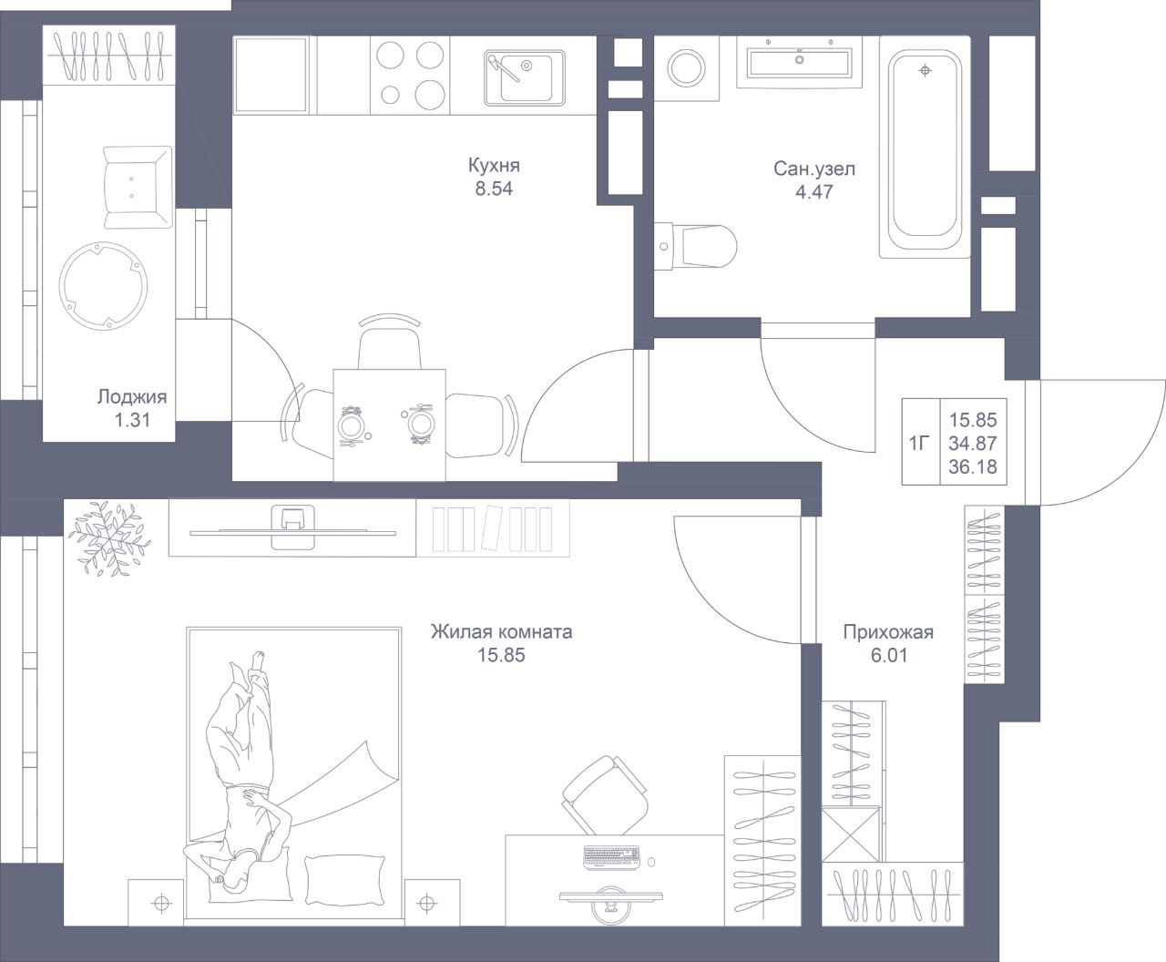 Просторная 1-комнатная квартира с гостиной в 15,85 кв.м. Высокие потолки 2, 7 м, правильная геометрия комнат для удобной меблировки. В прихожей достаточно места для создания вместительной гардеробной. Отдельная кухня, из которой открывается выход на лоджию.