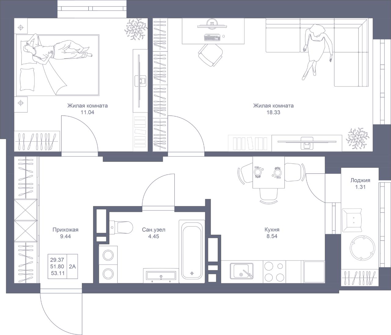 Продается 2-комнатная квартира 297 площадью 53,11 кв.м на 14 этаже 22-ти этажного дома проекта "Мой Ритм" от "Ак Барс Дом". Купить квартиру можно в ипотеку со ставкой от 4,5%.