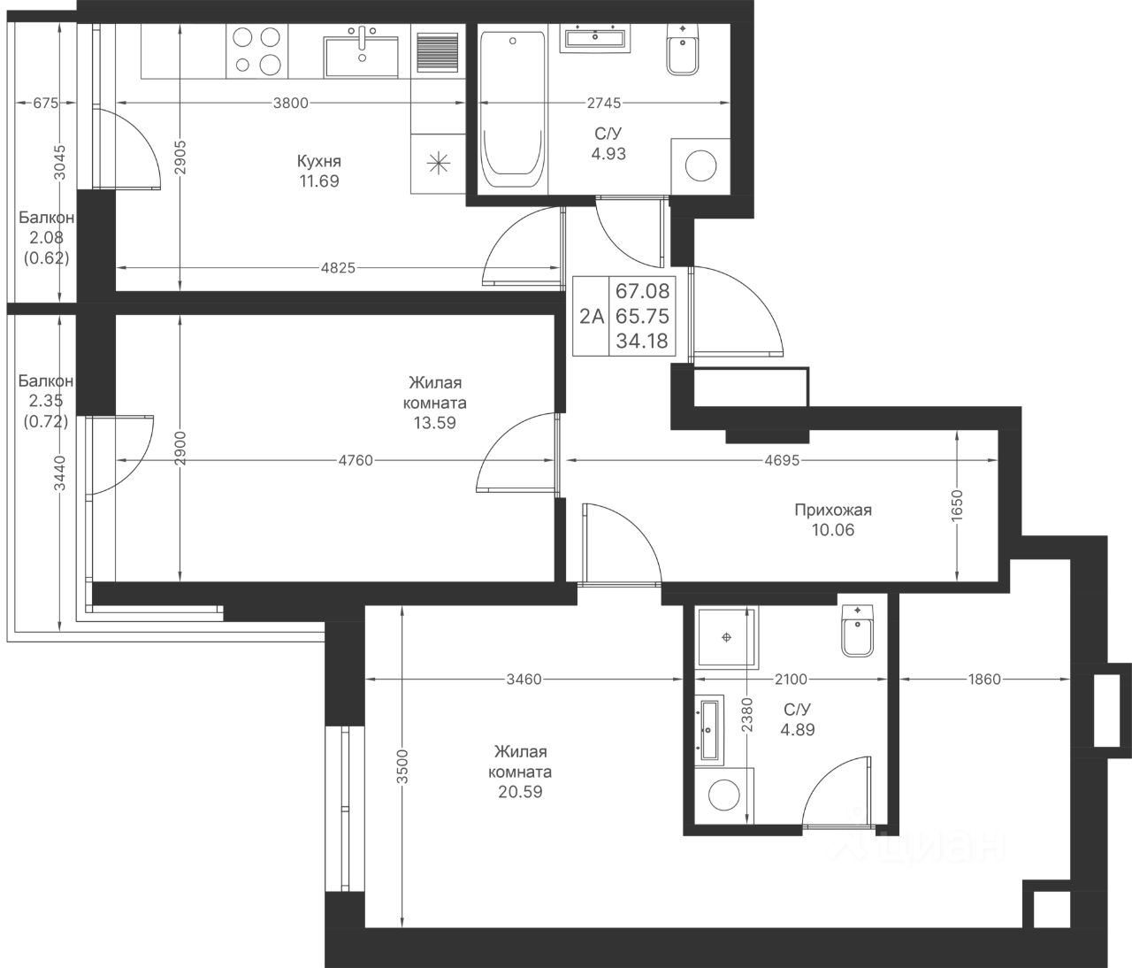 Продается 2-комнатная квартира 1 площадью 67,08 кв.м на 2 этаже в строящемся доме проекта "Мой Ритм" компании "Ак Барс Дом".