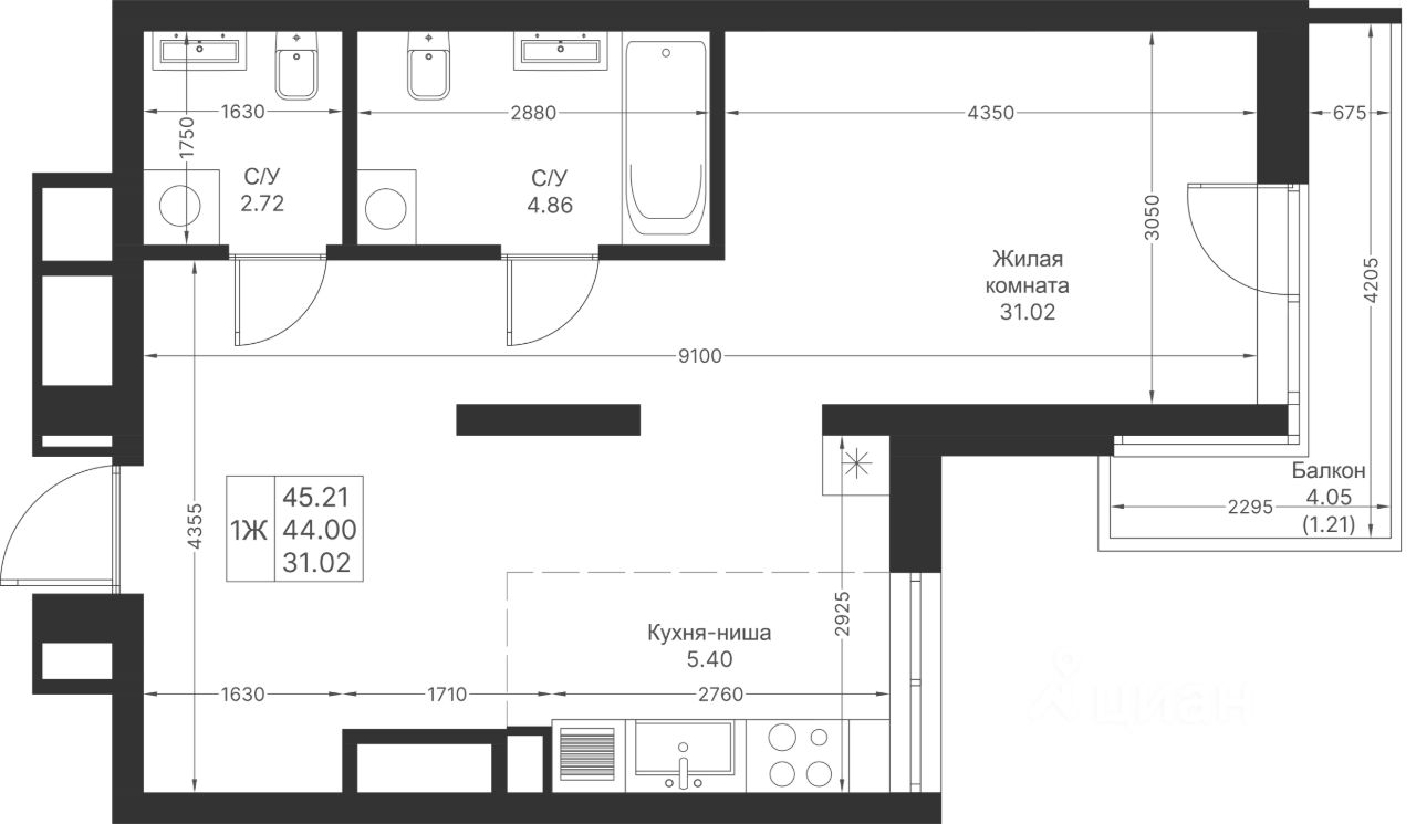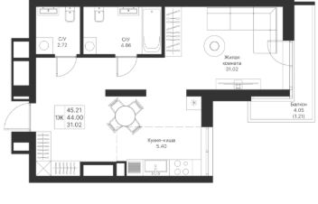 Продается 1-комнатная квартира 22 площадью 45,21 кв.м на 3 этаже в строящемся доме проекта "Мой Ритм" компании "Ак Барс Дом".