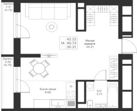 Продается 1-комнатная квартира 213 площадью 42,22 кв.м на 22 этаже в строящемся доме проекта "Мой Ритм" компании "Ак Барс Дом".
