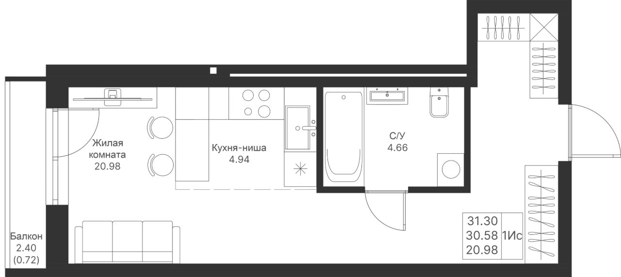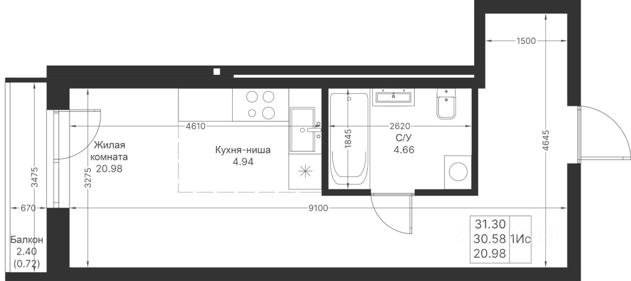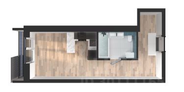 Уютная и продуманная студийная квартира с просторной жилой комнатой и кухней. Удачное зонирование на гостевое и личное пространство.