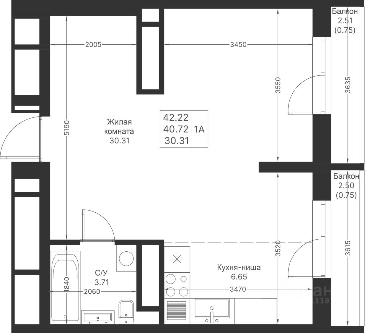 Продается квартира со свободной планировкой 816 площадью 42,22 кв.м на 21 этаже в строящемся доме проекта "Мой Ритм" компании "Ак Барс Дом".