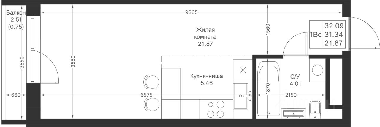 Продается студийная квартира 16 площадью 32,09 кв.м на 3 этаже в строящемся доме проекта "Мой Ритм" компании "Ак Барс Дом".