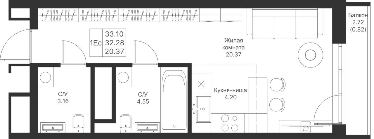 Уютная и продуманная студийная квартира с просторной жилой комнатой и кухней. Удачное зонирование на гостевое и личное пространство.