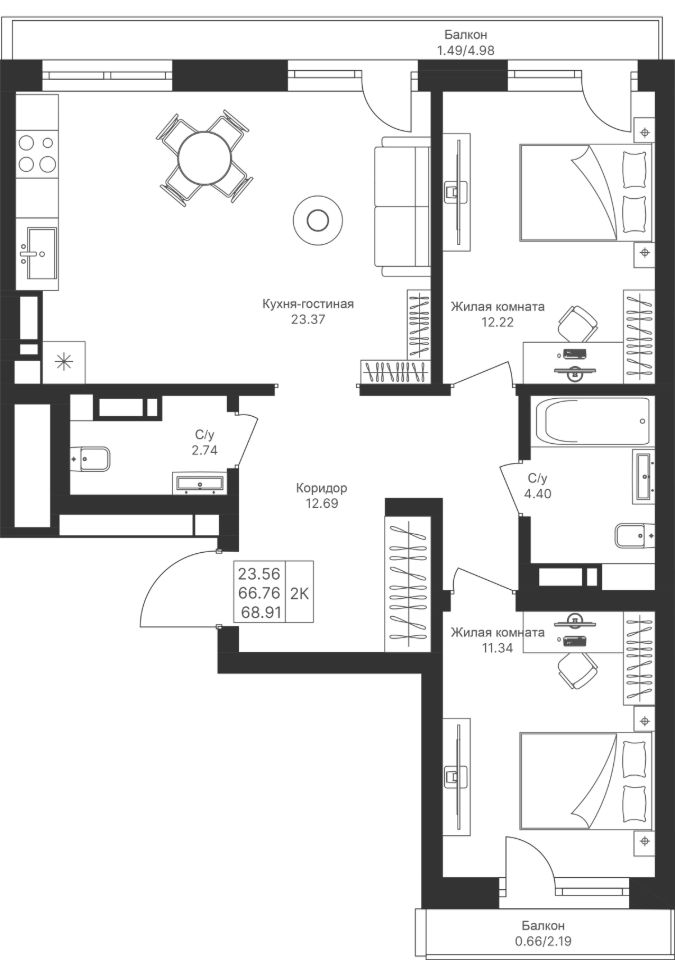 Для хранения вещей в коридоре есть место под шкаф-купе, а удачные пропорции жилых комнат позволят выгодно использовать пространство при расстановке мебели.