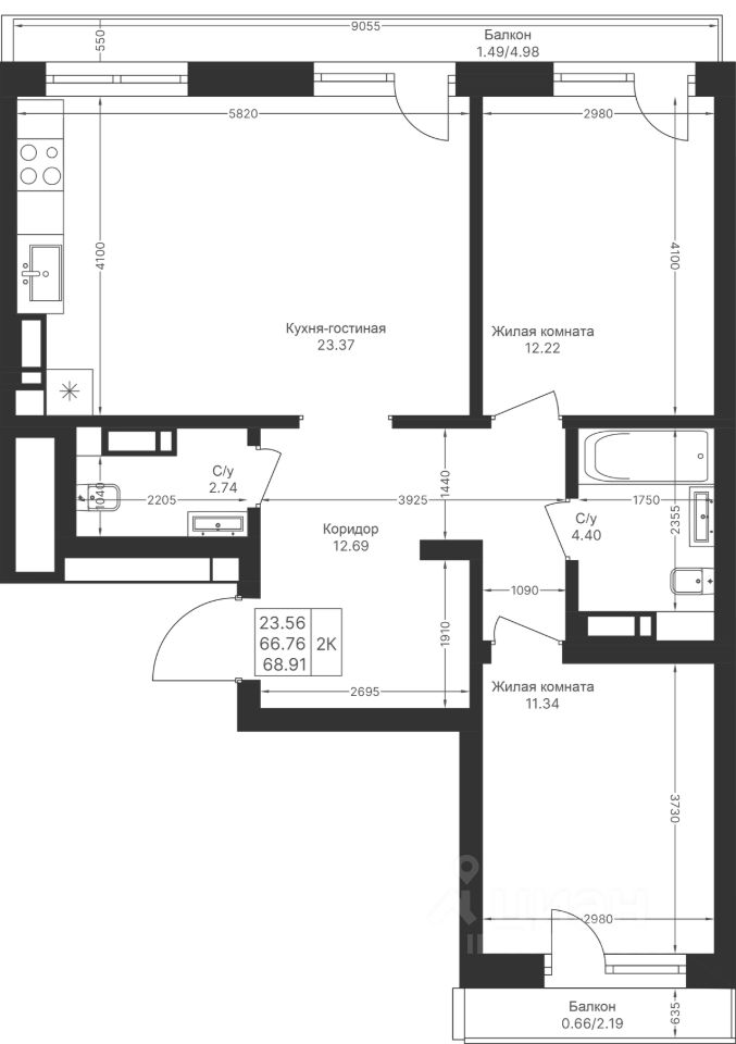 Продается 2 Евро-комнатная квартира 1 площадью 68,91 кв.м на 3 этаже в строящемся доме проекта "Мой Ритм" компании "Ак Барс Дом".