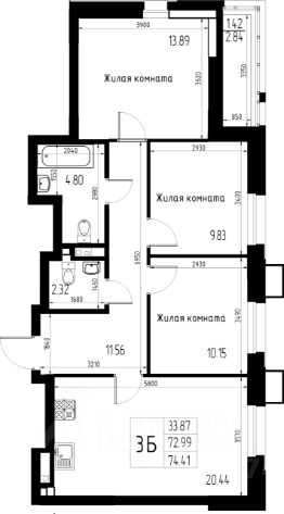 Продаётся 3-комнатная квартира 120 общей площадью 74.41 кв.м., на 2 этаже 13 этажного дома.