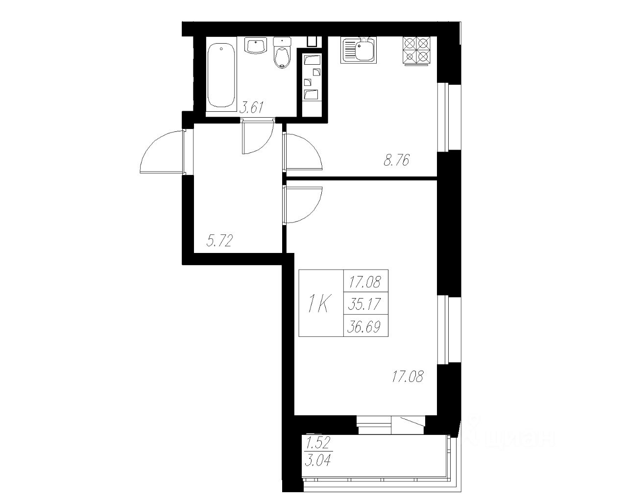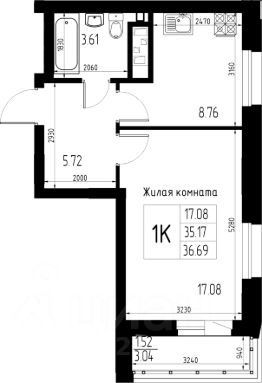 Продаётся 1-комнатная квартира 155 общей площадью 36.69 кв.м., на 4 этаже 13 этажного дома.