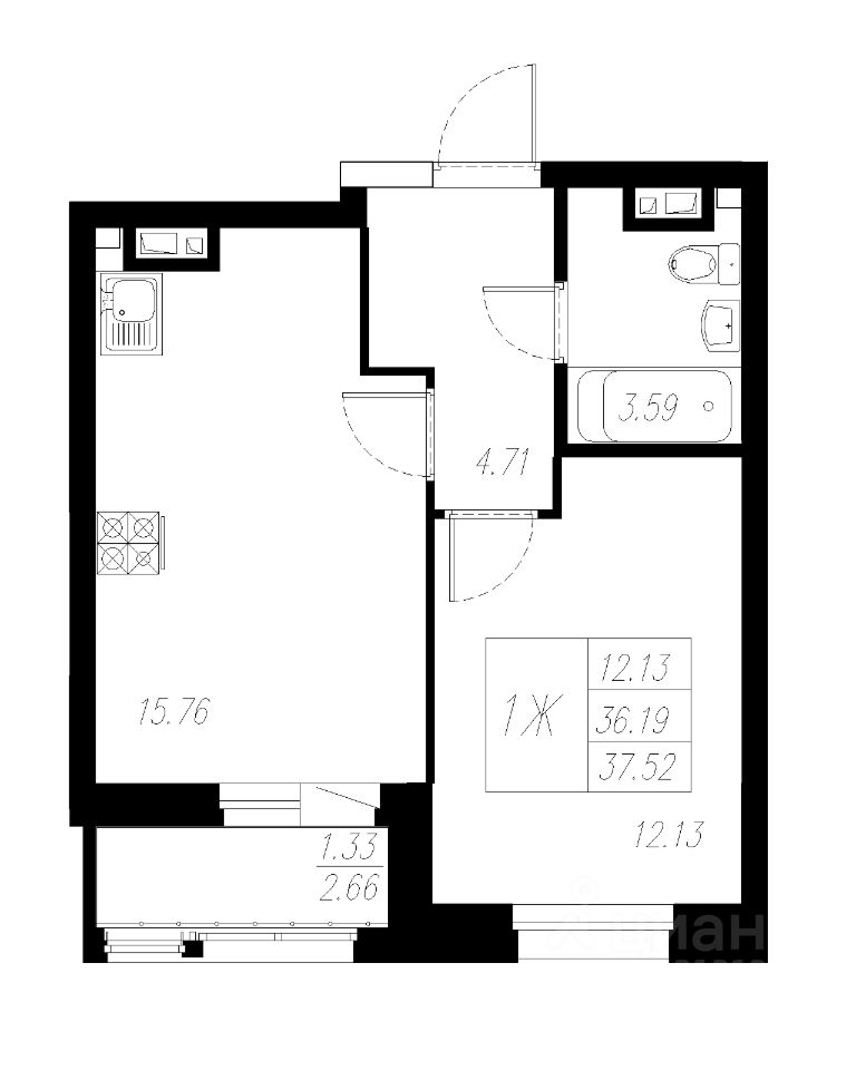 Продаётся 1-комнатная квартира 141 общей площадью 37.52 кв.м., на 6 этаже 13 этажного дома.