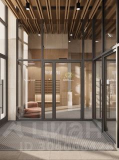 Входные группы из стекла, домофоны в теплом тамбуре, система грязезащиты и навигация обеспечивают удобство и безопасность.