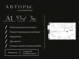 Продается 1-к квартира 7 в клубном доме "Авторы на Петербургской" на главной пешеходной улице Казани. Квартира на 1 этаже площадью 53,86 м², высотой потолков 3 м. Квартира сдается в свободной планировке, предоставляя полную свободу для ваших предпочтений в дизайне и возможность подстроить пространство под ваши жизненные ценности.