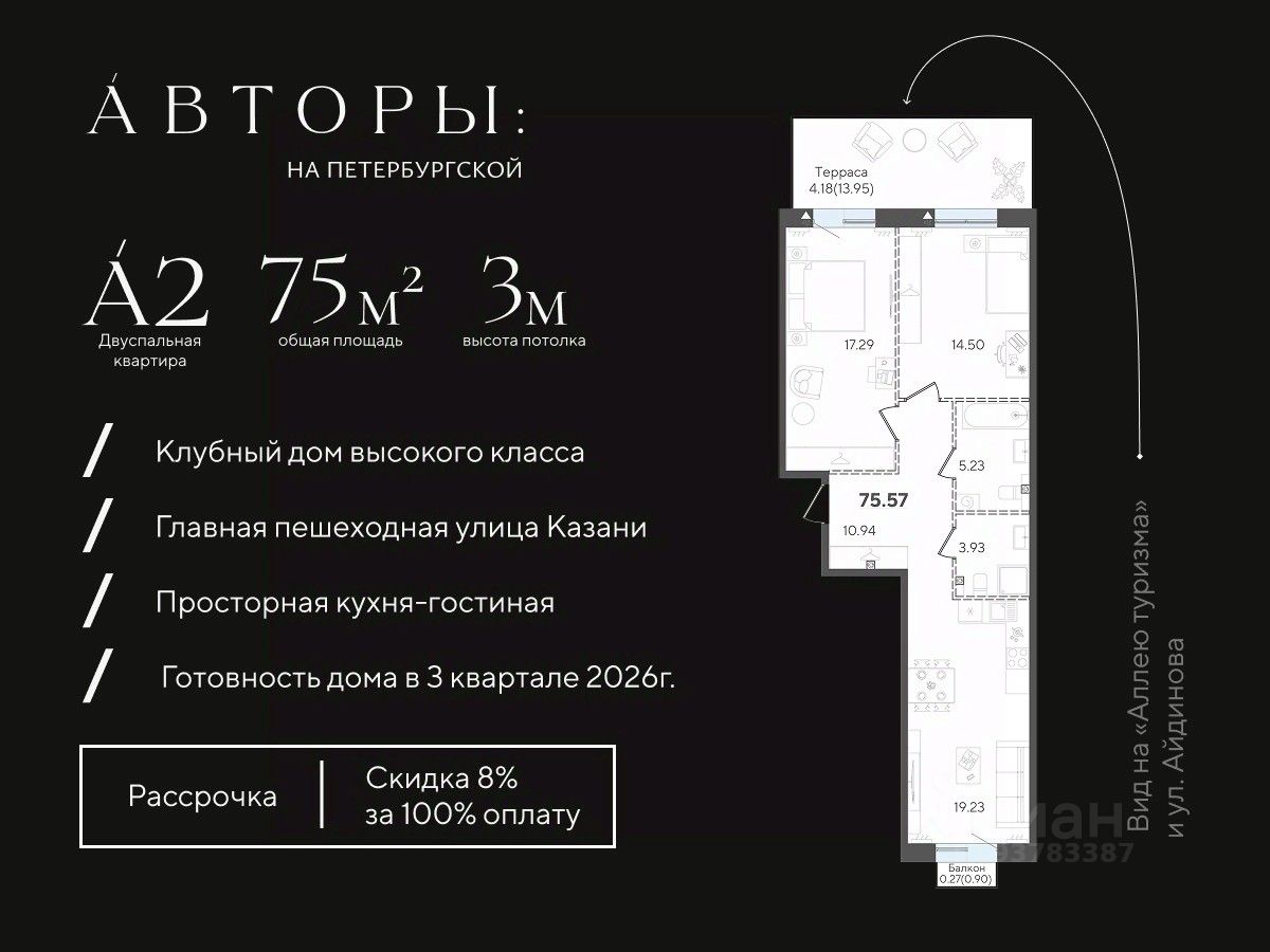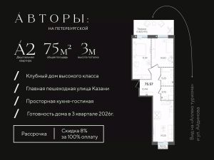 Продается 2-к квартира 23 в клубном доме "Авторы на Петербургской" на главной пешеходной улице Казани. Квартира на 2 этаже площадью 75,57 м², высотой потолков 3 м. Квартира сдается в свободной планировке, предоставляя полную свободу для ваших предпочтений в дизайне и возможность подстроить пространство под ваши жизненные ценности.