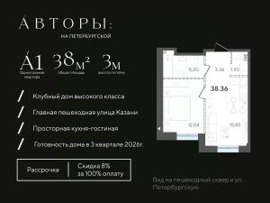 Продается 1-к квартира 54 в клубном доме "Авторы на Петербургской" на главной пешеходной улице Казани. Квартира на 2 этаже площадью 38,36 м², высотой потолков 3 м. Квартира сдается в свободной планировке, предоставляя полную свободу для ваших предпочтений в дизайне и возможность подстроить пространство под ваши жизненные ценности.