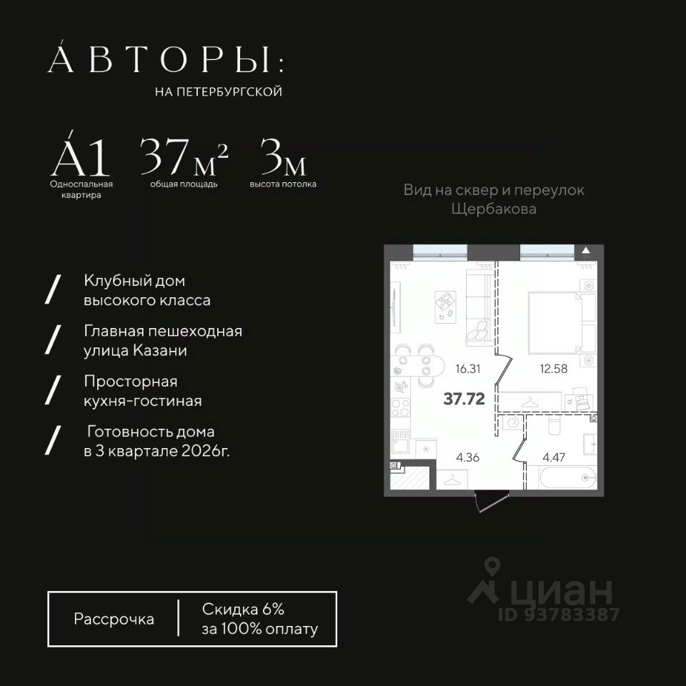 Продается 1-к квартира 61 в клубном доме "Авторы на Петербургской" на главной пешеходной улице Казани. Квартира на 4 этаже площадью 37,72 м², высотой потолков 3 м. Квартира сдается в свободной планировке, предоставляя полную свободу для ваших предпочтений в дизайне и возможность подстроить пространство под ваши жизненные ценности.