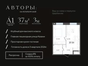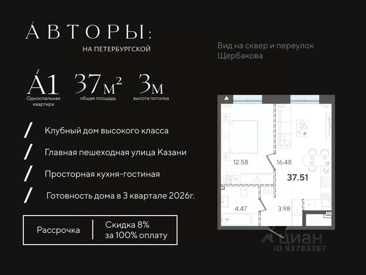 Продается 1-к квартира 62 в клубном доме "Авторы на Петербургской" на главной пешеходной улице Казани. Квартира на 4 этаже площадью 37,51 м², высотой потолков 3 м. Квартира сдается в свободной планировке, предоставляя полную свободу для ваших предпочтений в дизайне и возможность подстроить пространство под ваши жизненные ценности.