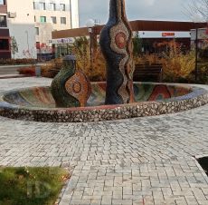 Установлена детская площадка, фонтан.