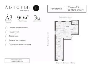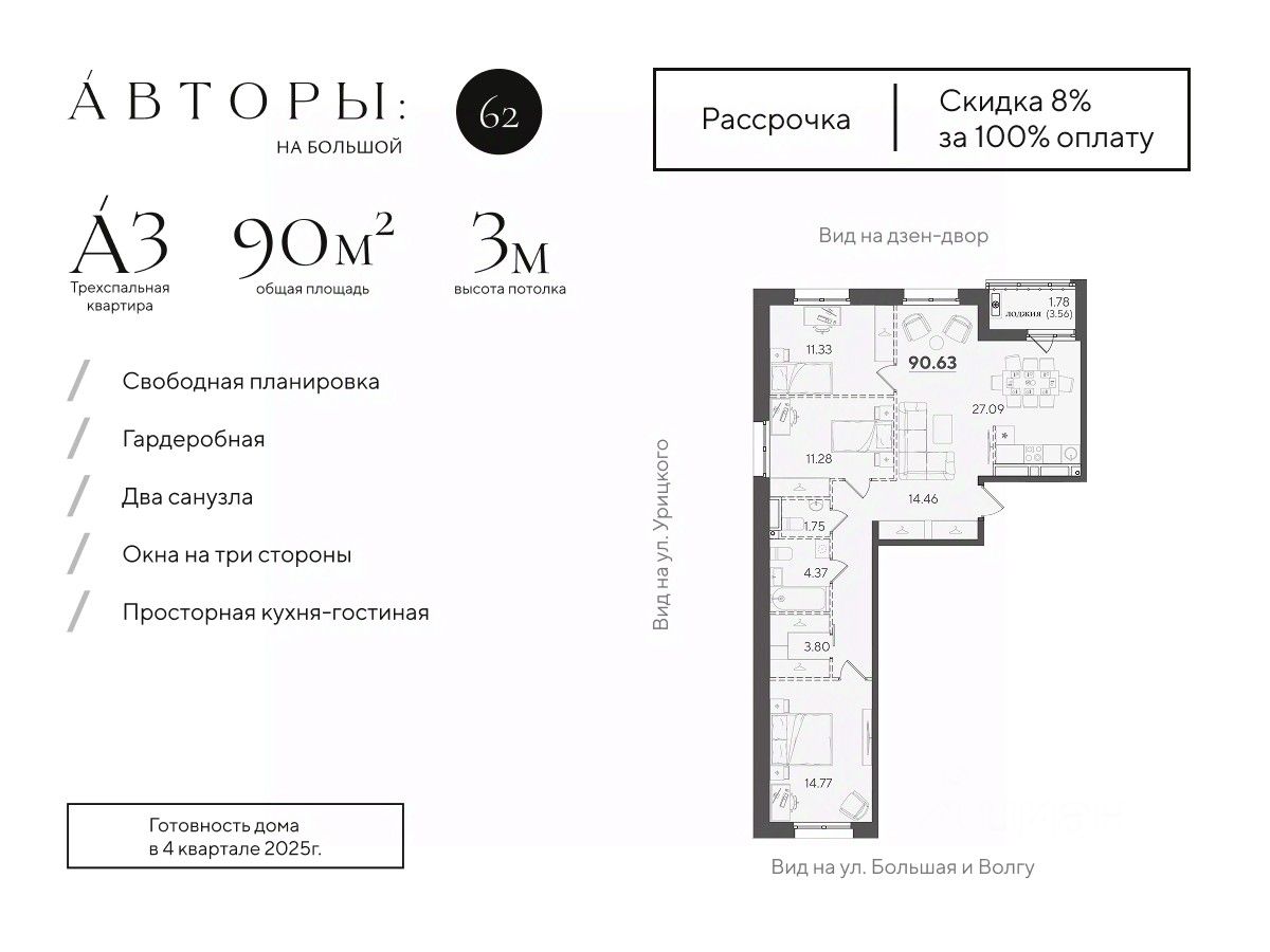 Продается видовая 3-к квартира 20 в клубном доме "Авторы на Большой 62". Квартира с тремя спальнями на 5 этаже площадью 90.63 м², кухней-гостинной площадью 27.09 м², высотой потолков 3 м и двумя санузлами. Окна выходят на две стороны и открывают вид на дзен-двор с обильным озеленением и ул. Урицкого. Квартира сдается в свободной планировке, предоставляя полную свободу для ваших предпочтений в дизайне и возможность подстроить пространство под ваши жизненные ценности.