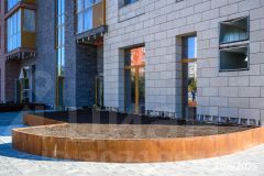 Дзен-двор разработан в концепции "городской гостиной", оснащенной барной сткойкой для уютных встреч и коворкингом для комфортной работы на открытом воздухе. Детская зона вдохновлена тематикой реки и её естественной средой. Площадь двора составляет 1100 м², на которых расположатся более 15 видов декоративных растений и цветников.
