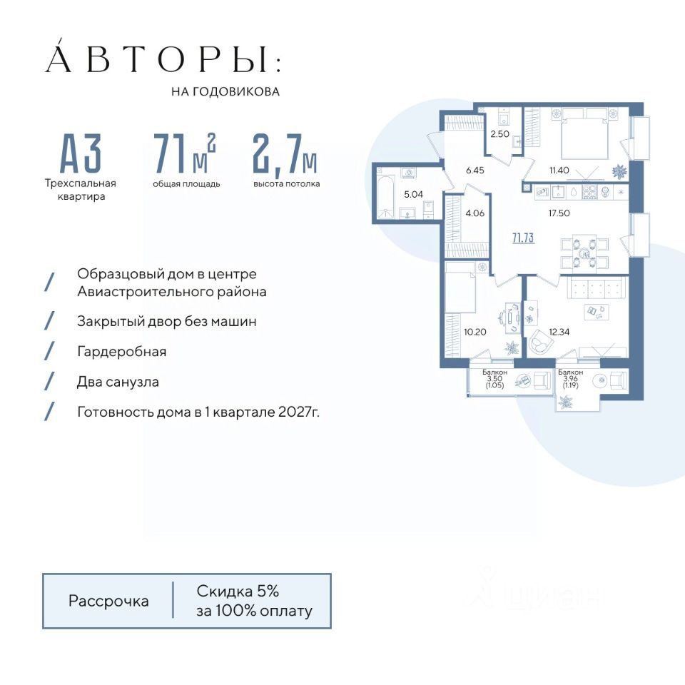 Подробнее - звоните! Продается 3-к квартира 24 в образцовом доме "Авторы на Годовикова" в центре Авиастроительного района. Квартира на 5 этаже площадью 71,73 м², кухней-гостиной и высотой потолков 2,7 м. Квартира сдается в предчистовой отделке со стяжкой полов, предоставляя полную свободу для ваших предпочтений в дизайне.