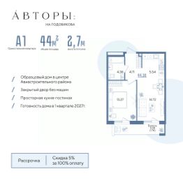 Продается 1-к квартира 33 в образцовом доме "Авторы на Годовикова" в центре Авиастроительного района. Квартира на 6 этаже площадью 44.38 м², кухней-гостиной и высотой потолков 2.7 м. Квартира сдается в предчистовой отделке со стяжкой полов, предоставляя полную свободу для ваших предпочтений в дизайне.