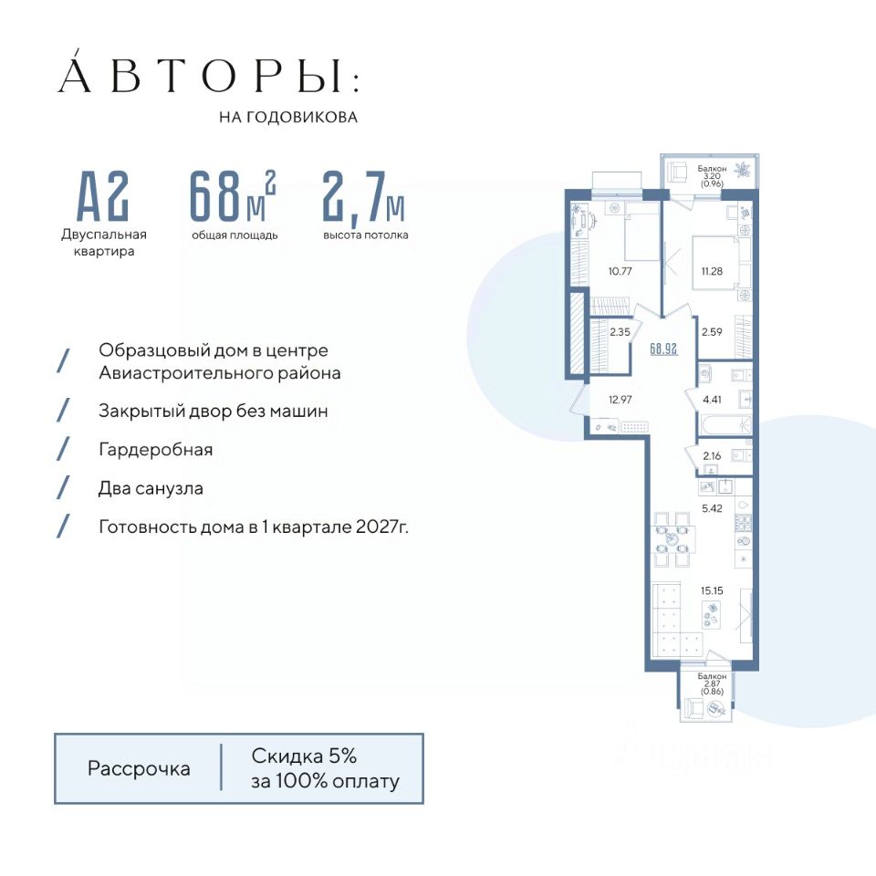 Продается 2-к квартира 57 в образцовом доме "Авторы на Годовикова" в центре Авиастроительного района. Квартира на 5 этаже площадью 68.92 м², кухней-гостиной и высотой потолков 2.7 м. Квартира сдается в предчистовой отделке со стяжкой полов, предоставляя полную свободу для ваших предпочтений в дизайне.