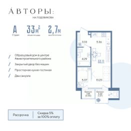 Продается студия 58 в образцовом доме "Авторы на Годовикова" в центре Авиастроительного района. Квартира на 5 этаже площадью 33.11 м², кухней-гостиной и высотой потолков 2.7 м. Квартира сдается в предчистовой отделке со стяжкой полов, предоставляя полную свободу для ваших предпочтений в дизайне.