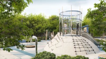 Двор в концепции траектории полета создает единую линию движения. На территории дома есть многофункциональная зона для йоги и настольных игр, детская зона для комфортных прогулок юных жителей, многофункциональная спортивная площадка со скалолазанием и площадка для выгула собак. Обильное озеленение из 25 видов растений и несколько игровых зон для юных жителей разных возратов: для детей до 3-х лет — песочница, горка и качели; для детей от 4 до 14 лет — большой игровой комплекс, включающий горки, качели, карусели, переговорные трубы и мягкую геопластику, в которой прячутся тоннели.
