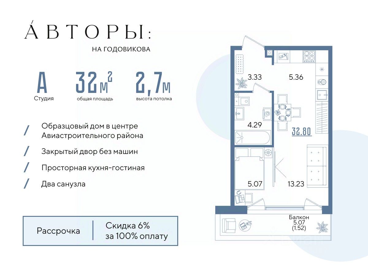 Возможно приобретение со скидкой 6% при полной оплате, в рассрочку с первым взносом 30%, а также оформление ипотеки.