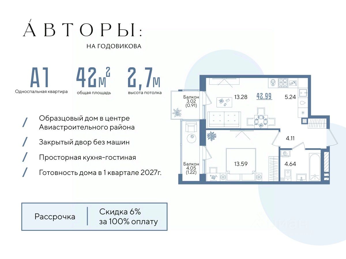 Возможно приобретение со скидкой 6% при полной оплате, в рассрочку с первым взносом 30%, а также оформление ипотеки.