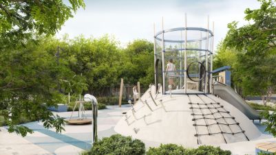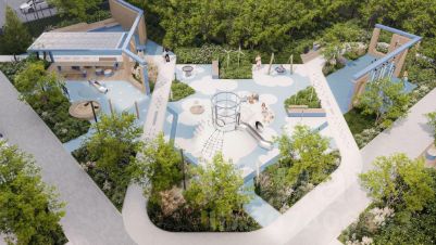 Двор в концепции траектории полета создает единую линию движения. На территории дома есть многофункциональная зона для йоги и настольных игр, детская зона для комфортных прогулок юных жителей, многофункциональная спортивная площадка со скалолазанием и площадка для выгула собак. Обильное озеленение из 25 видов растений и несколько игровых зон для юных жителей разных возратов: для детей до 3-х лет — песочница, горка и качели; для детей от 4 до 14 лет — большой игровой комплекс, включающий горки, качели, карусели, переговорные трубы и мягкую геопластику, в которой прячутся тоннели.