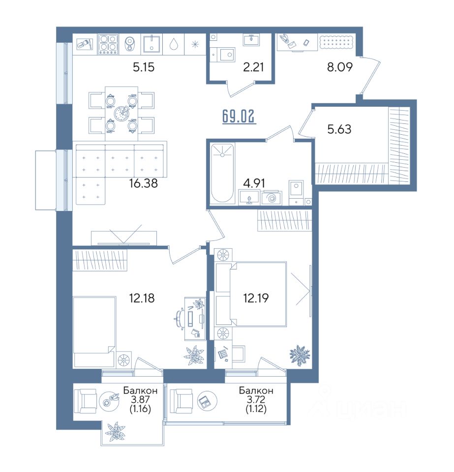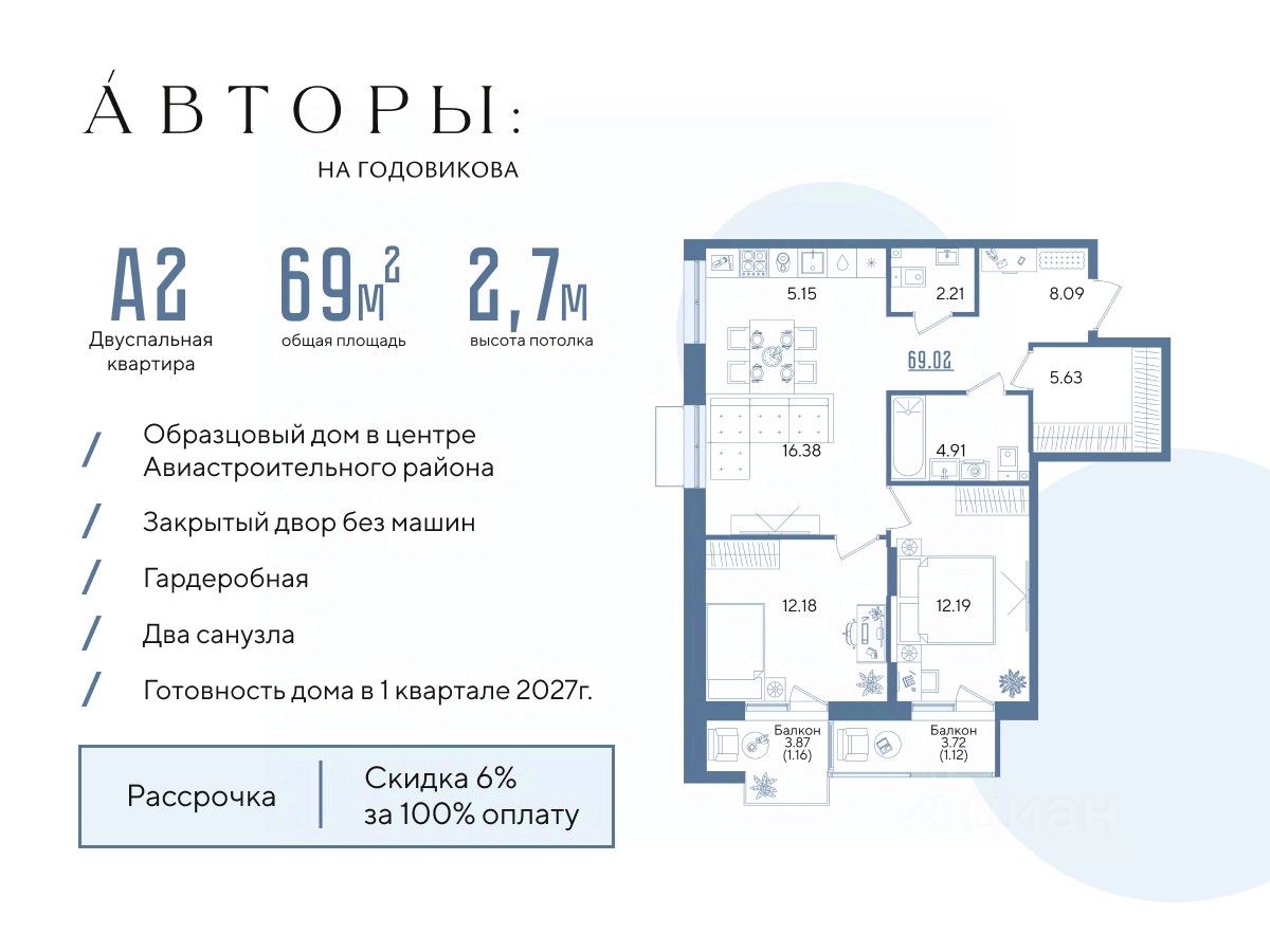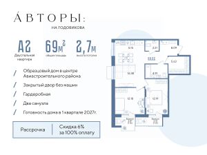 Продается 2-к квартира 161 в образцовом доме "Авторы на Годовикова" в центре Авиастроительного района. Квартира на 12 этаже площадью 69.02 м², кухней-гостиной и высотой потолков 2.7 м. Квартира сдается в предчистовой отделке со стяжкой полов, предоставляя полную свободу для ваших предпочтений в дизайне.