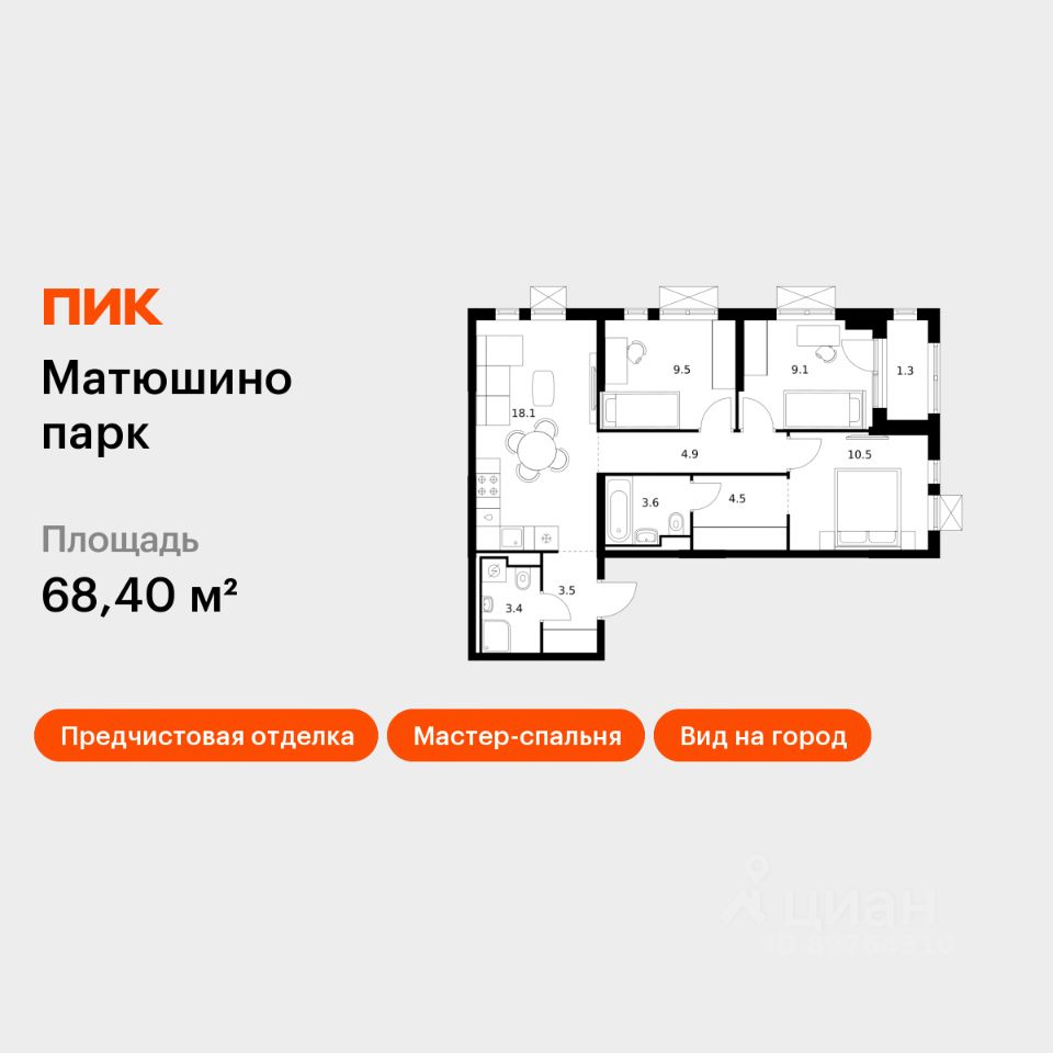 Продаётся 3-комн. квартира площадью 68,4 кв.м на 6 этаже 22 этажного дома (Корпус 2, Секция 1) проекта ПИК Матюшино парк. Светлый просторный подъезд на уровне земли, функциональная планировка, большие окна, предчистовая отделка.