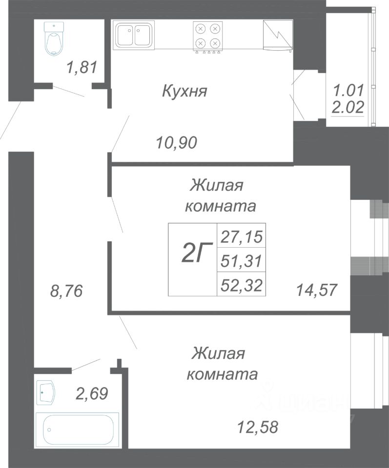 Продаётся 2 комнатная квартира 131 — 52.32 кв. м. Расположена на 7 этаже. Дом построен из силикатного кирпича.