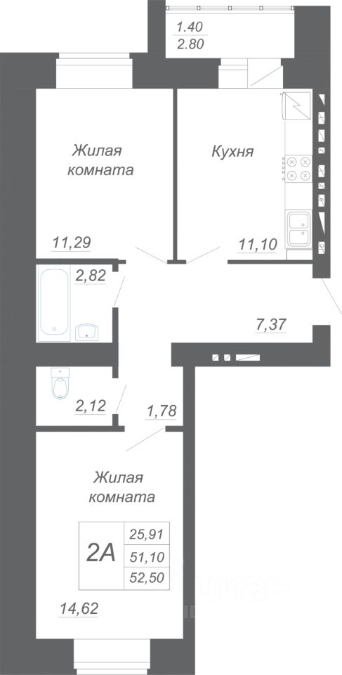 Продаётся 2 комнатная квартира 221 — 52.5 кв. м. Расположена на 4 этаже. Дом построен из силикатного кирпича.