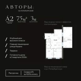 Продается 2-к квартира 2 в клубном доме "Авторы на Петербургской" на главной пешеходной улице Казани. Квартира на 1 этаже площадью 75,02 м², высотой потолков 3 м. Квартира сдается в свободной планировке, предоставляя полную свободу для ваших предпочтений в дизайне и возможность подстроить пространство под ваши жизненные ценности.