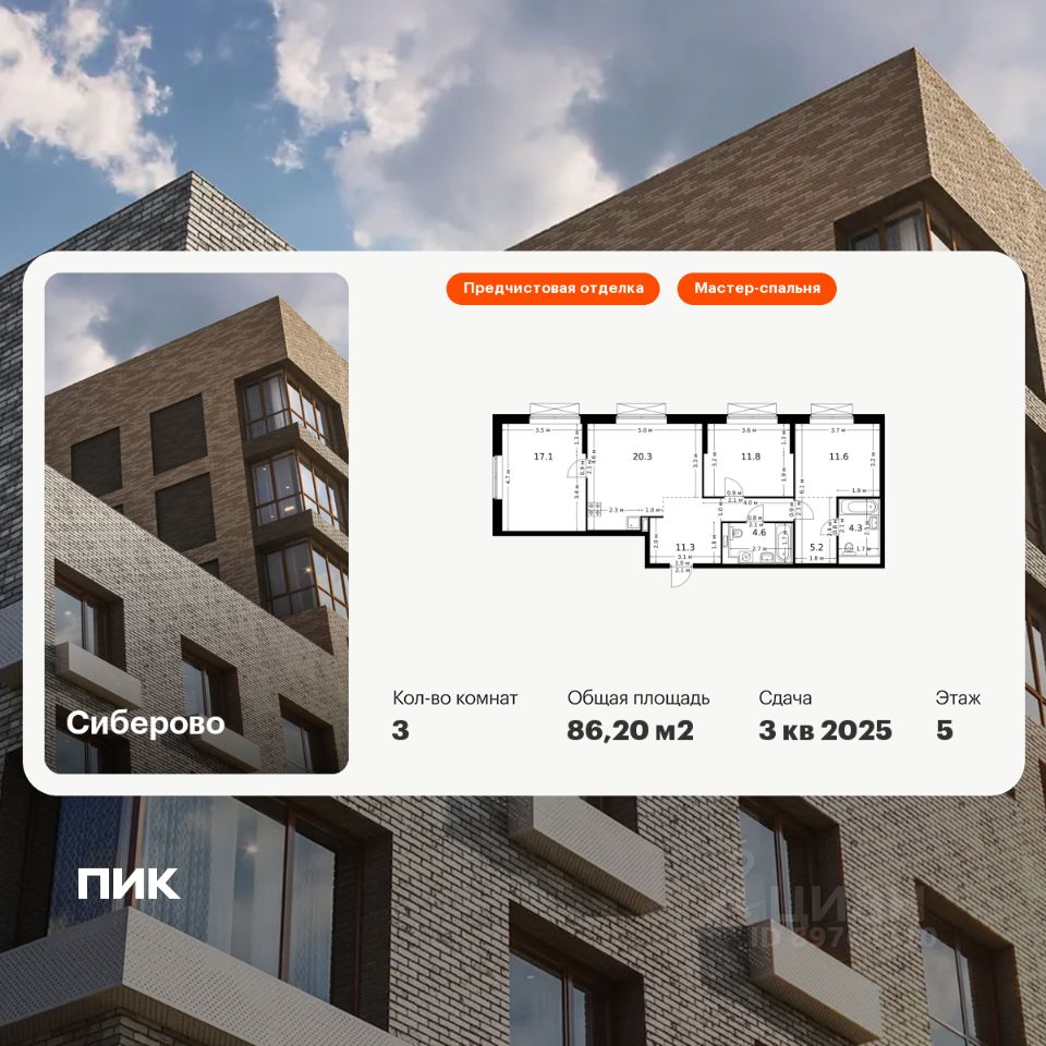 Продаётся 3-комн. квартира площадью 86,2 кв.м на 5 этаже 16 этажного дома (Корпус 1, Секция 7) проекта ПИК Сиберово. Светлый просторный подъезд на уровне земли, функциональная планировка, большие окна, предчистовая отделка.