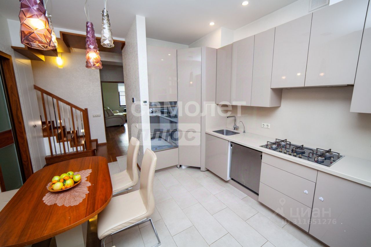 На первом этаже в квартире располагается кухня, кабинет, гостевая комната, зал, санузел и подсобные помещения. На втором этаже по разные стороны располагается большая спальня с лоджией, два санузла и детская комната с французским балконом. Во всей квартире высота потолков 3 метра, очень светло и просторно!