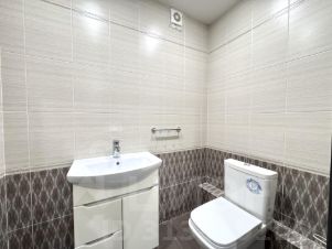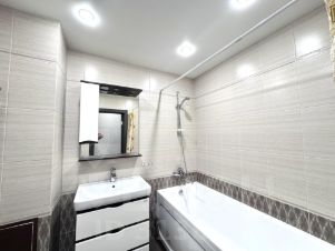 На полу в гостиной и спальной комнате качественный ламинат, на стенах обои, потолки натяжные со встроенными премиальными светильниками и люстрами. В санузле установлена акриловая ванна, водонагреватель горячей воды, и ванная мебель.