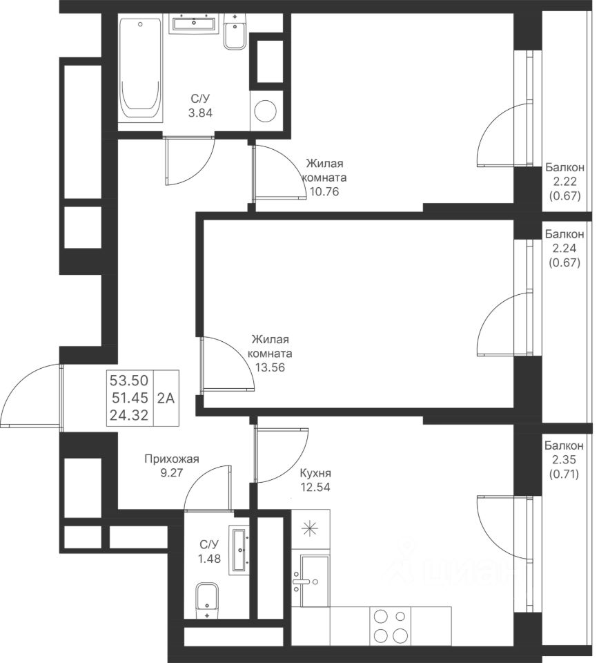 Продается 2-комнатная квартира 568 площадью 53,5 кв.м на 12 этаже в строящемся доме проекта "Мой Ритм" компании "Ак Барс Дом".