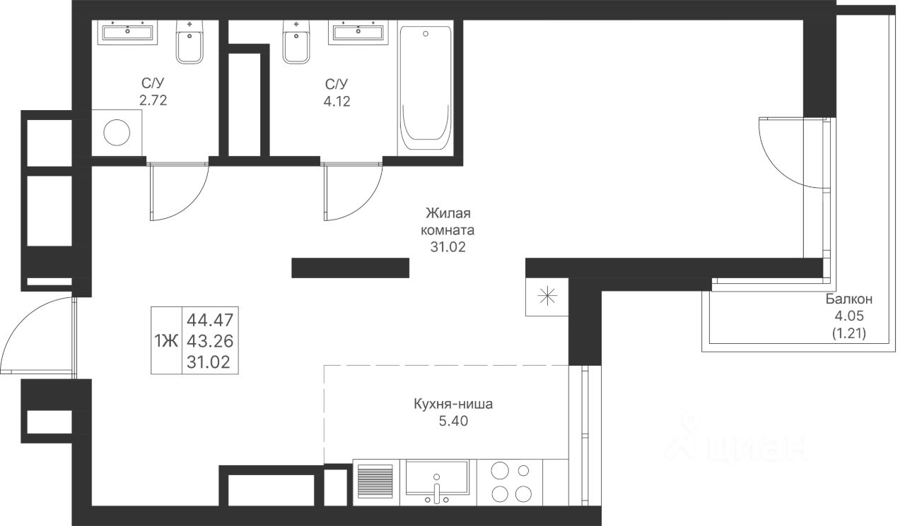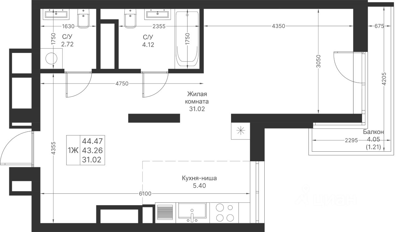 Продается 1-комнатная квартира 37 площадью 44,47 кв.м на 4 этаже в строящемся доме проекта "Мой Ритм" компании "Ак Барс Дом".
