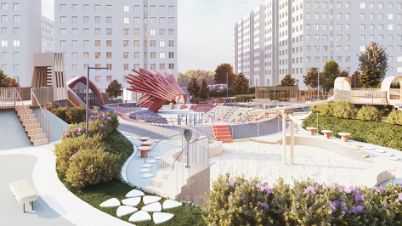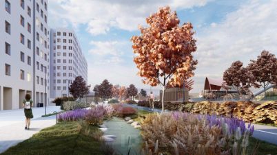 Экологичные детские площадки, спортивные зоны с резиновым покрытием, озеленение.