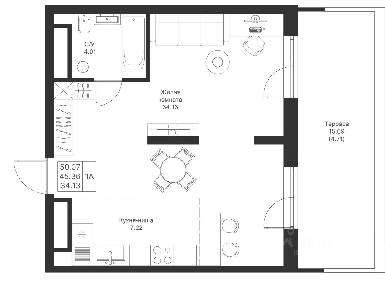 Уютная и продуманная 1-комнатная квартира с просторной жилой комнатой и кухней. Удачное зонирование на гостевое и личное пространство.