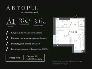 Продается односпальный пентхаус 72 в клубном доме "Авторы на Петербургской" на главной пешеходной улице Казани. Квартира на 5 этаже площадью 36,21 м², высотой потолков до 3,6 м. Квартира сдается в свободной планировке, предоставляя полную свободу для ваших предпочтений в дизайне и возможность подстроить пространство под ваши жизненные ценности.