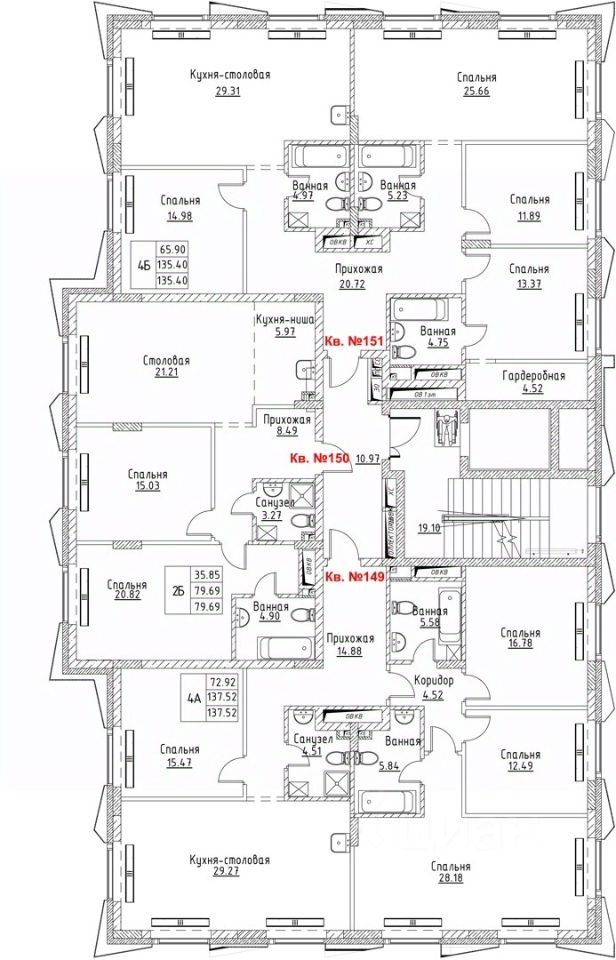 4 комнатная квартира площадью 137.52 кв.м. на 4 этаже в строящемся жилом комплексе премиум-класса "Академик".