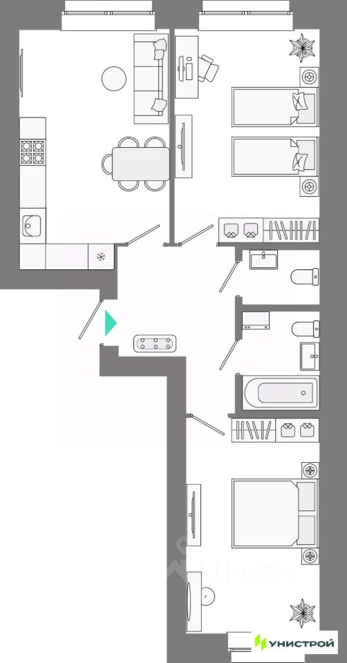 Представлен широкий выбор планировок — от студий до просторных семейных квартир. Доступны варианты с террасами, мастер-спальнями и гардеробными. Во всех квартирах выполнена качественная предчистовая отделка.