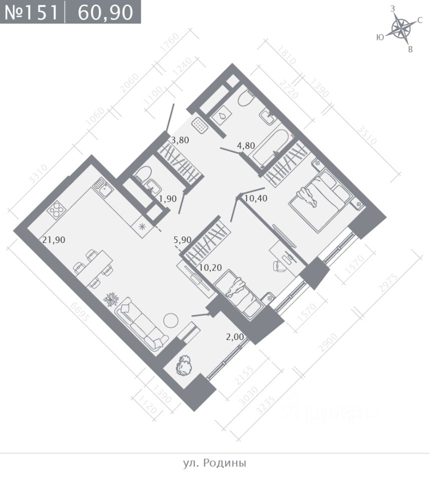 Продаётся 2-комнатная квартира в строящемся доме (Корпус 1), срок сдачи: II-кв. 2028, общей площадью 60.9 кв.м., на 18 этаже.